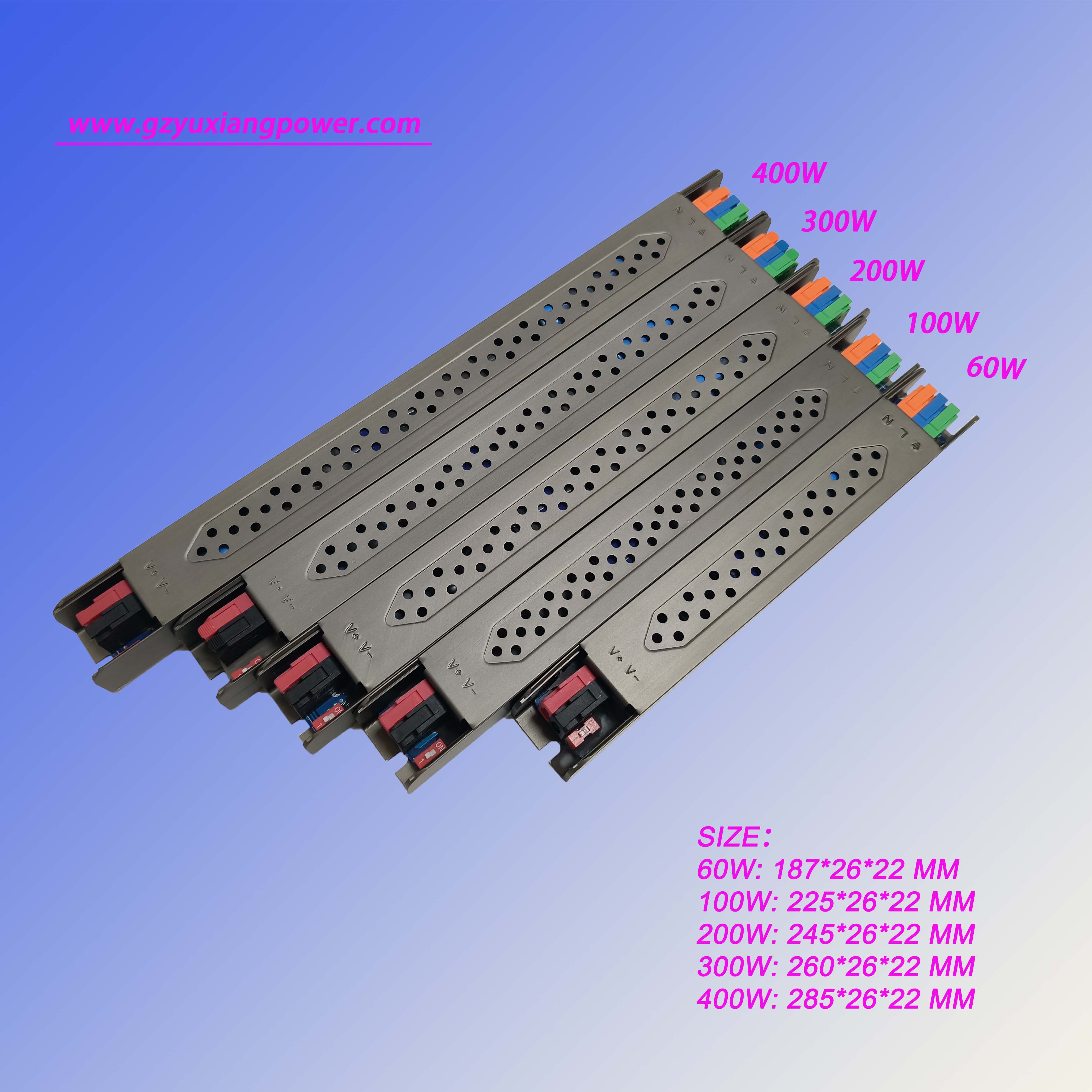 4. Cette alimentation LED réglable ultra-étroite offre des puissances nominales comprenant 60 W, 100 W, 200 W et400W, répondant à divers besoins en énergie, des espaces compacts aux projets à grande échelle.